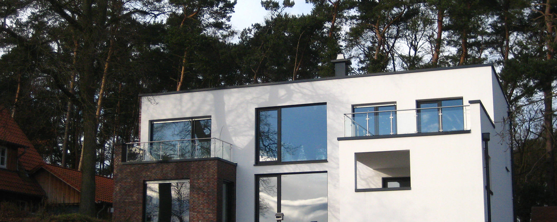 Das Gelände steigt nach Norden um mehrere Meter an und ist mit Kiefern, Eichen und kleineren Sträuchern dicht bewachsen. Der Entwurf für dieses Wohnhaus geht auf die besondere Topografie des Ortes ein; die Lage auf dem Grundstück ist so gewählt, das eine alte Eiche neben der Terrasse erhalten bleibt.